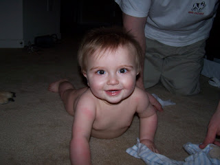 Bray and Becky hung out in the backyard the other day while I was cutting the grass. He loves the wind in his hair, he gets all smiley. As you can see he crawled to the edge of the blanket and started checking out the grass. We have bermuda grass in our yard that goes dormant all winter and comes back green in the spring... its about half way there.